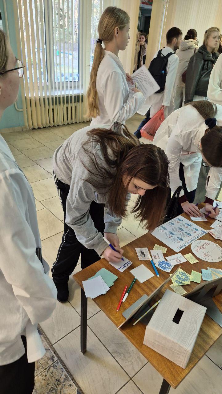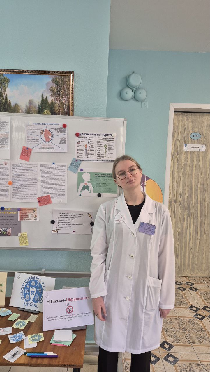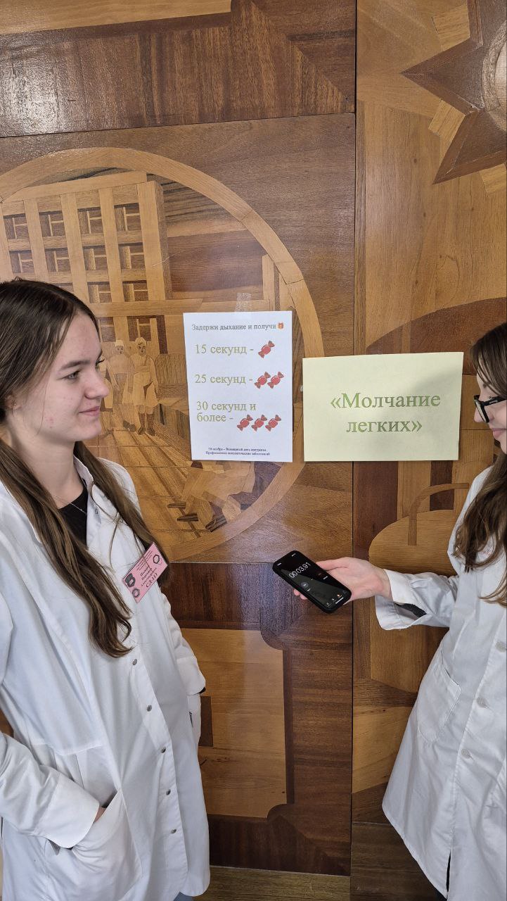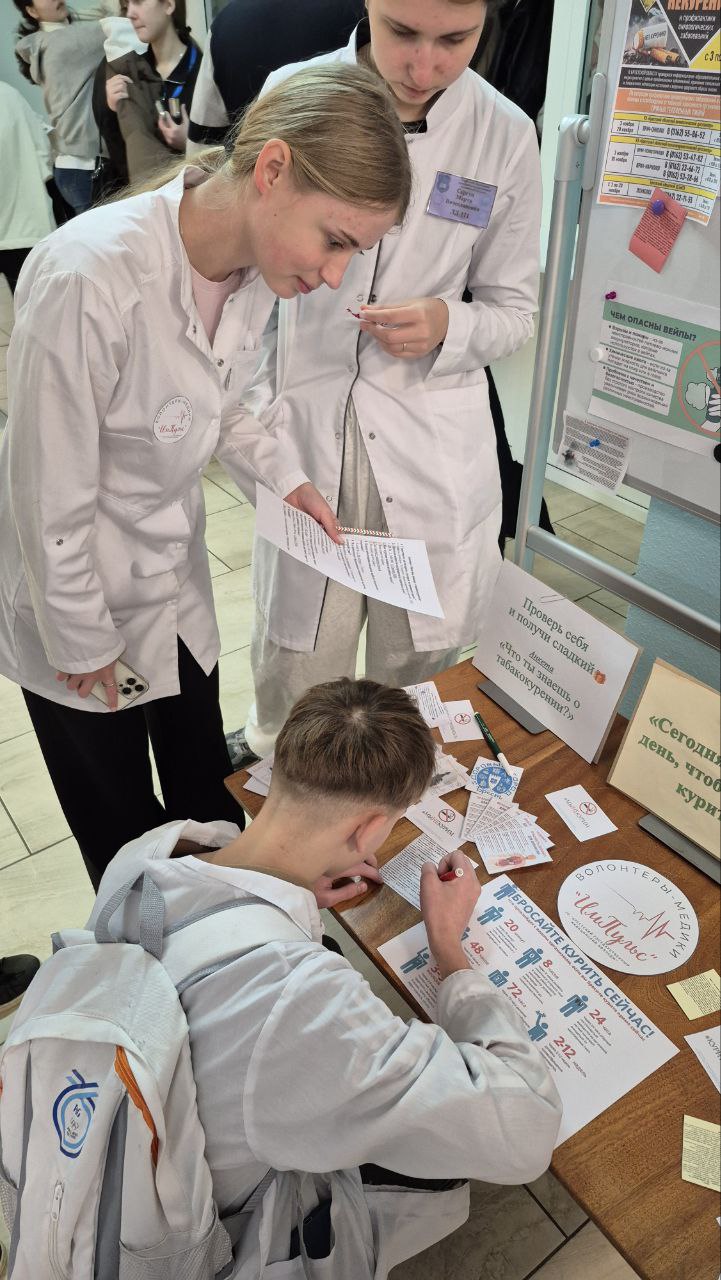 19 ноября в фойе колледжа волонтерами-медиками отряда «ИмПульс» была организована и проведена информационно-просветительская акция «Сегодня отличный день, чтобы бросить курить!». Учащиеся учебной группы ЛД-111, специальности «Лечебное дело» подготовили наглядные материалы и рассказали о вреде курения для здоровья, включая и электронные сигареты, и связь курения с онкологическими заболеваниями, были продемонстрированы тематические ролики.