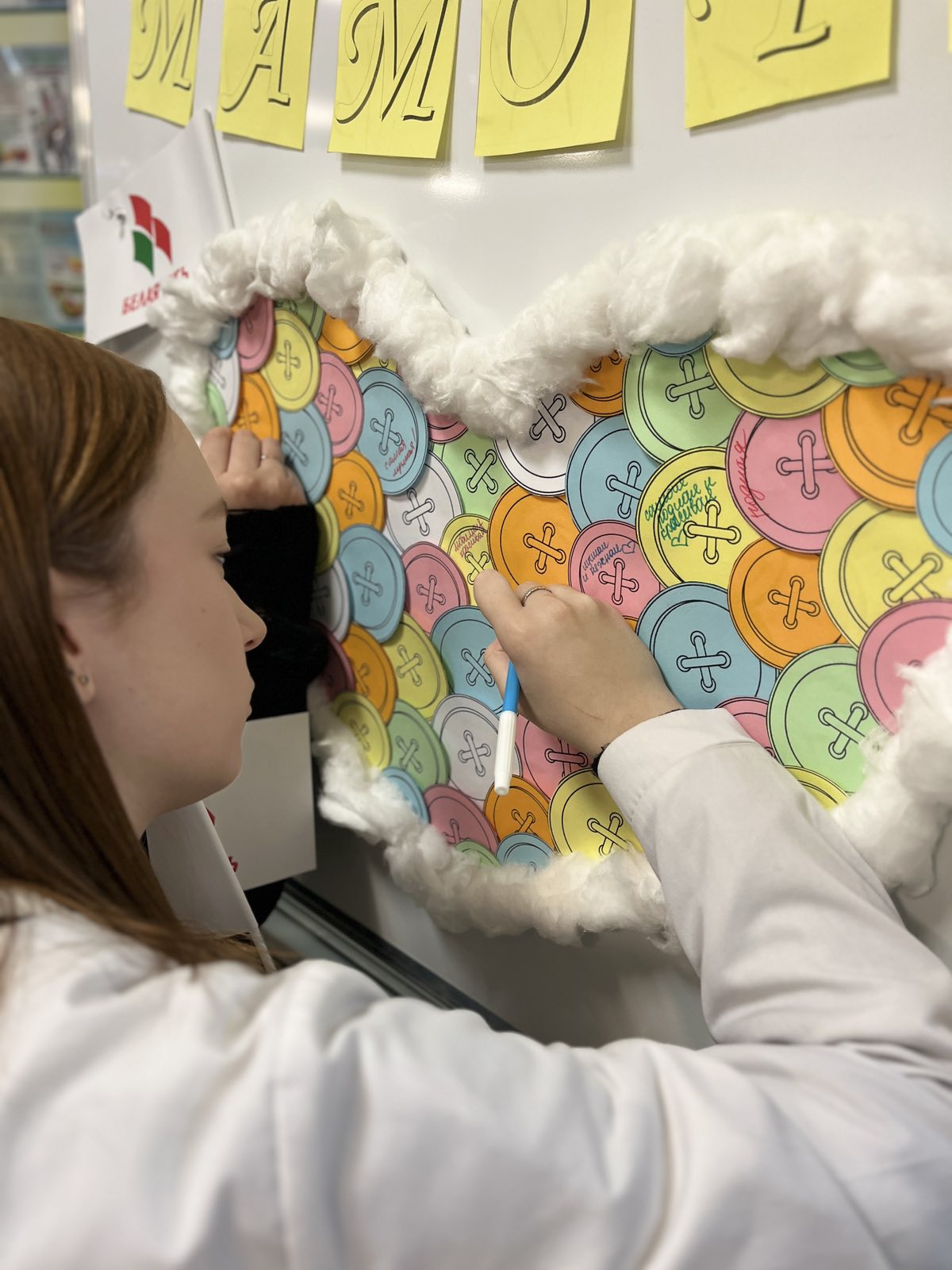 Так, «Белая Русь» во главе с председателем Дарьей Вячеславовной Пилипович организовала акцию «Мама-пуговка, на ней держится весь мир». Учащиеся создавали миниатюрные символы любви, оставляя на пуговицах тёплые слова, добрые пожелания и сокровенные воспоминания о мамах. Эти маленькие «носители любви» стали ярким напоминанием о том, что мама — та самая опора, что держит на себе весь мир.