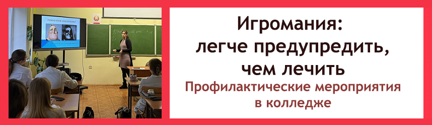 Теме азартно-игрового расстройства были посвящены три мероприятия, проведённые с 26 по 28 ноября в колледже и общежитии. У участников была возможность обсудить способы вовлечения человека в гемблинг, ключевые характеристики игровой зависимости и факторы, повышающие риск её формирования. Были освещены последствия игровой зависимости для самого человека, его окружения, а также возможности получения помощи.