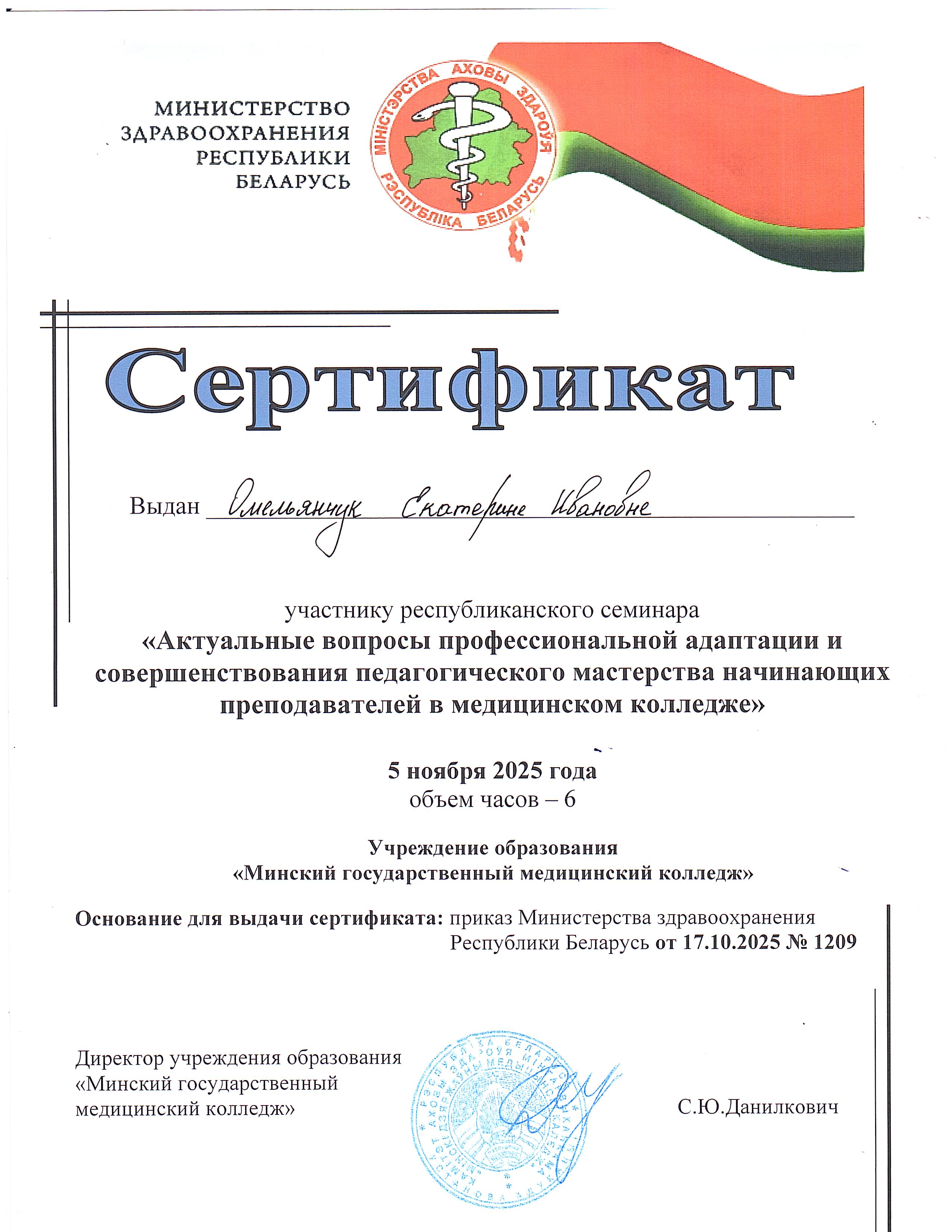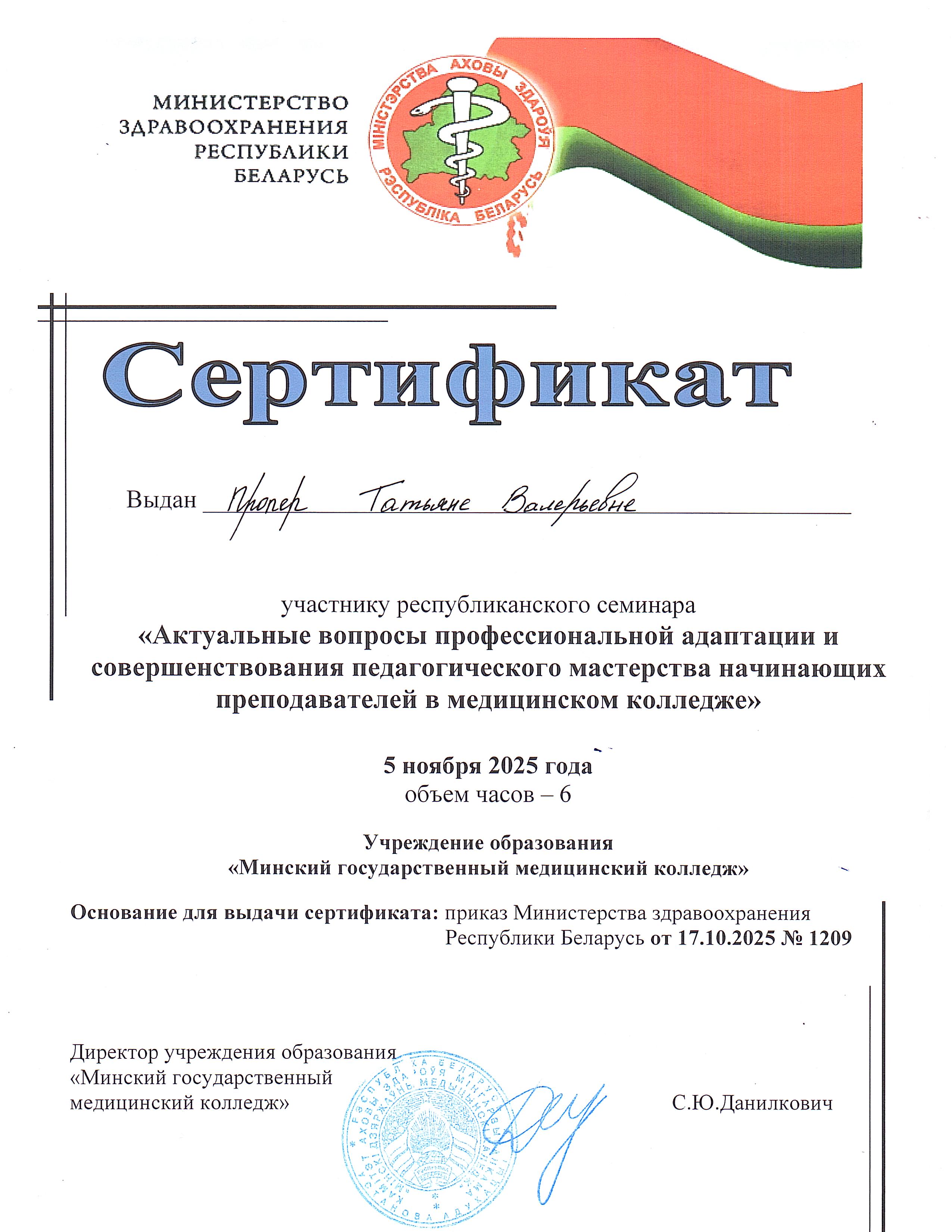 Приказом Министерства здравоохранения Республики Беларусь от 17.10.2025 № 1209 преподавателям учреждения образования «Брестский государственный медицинский колледж» Омельянчук Екатерине Ивановне и Пропер Татьяне Валерьевне были вручены сертификаты участников Республиканского семинара «Актуальные вопросы профессиональной адаптации и совершенствования педагогического мастерства начинающих преподавателей в медицинском колледже».