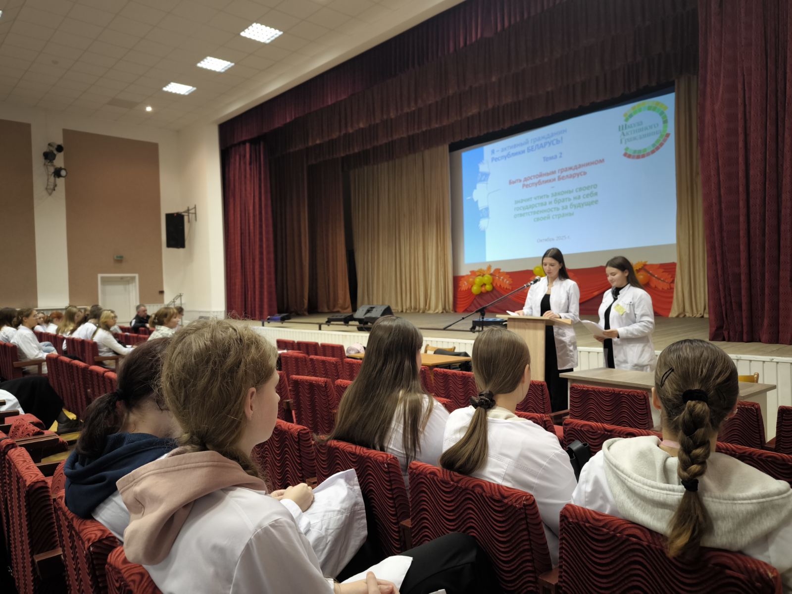 В рамках реализации информационно-образовательного проекта ШАГ в учреждении образования «Брестский государственный медицинский колледж» проведен кураторский час по теме: «Быть достойным гражданином Республики Беларусь – значит чтить законы своего государства и брать на себя ответственность за будущее своей страны». Выступили учащиеся учебной группы СД-224 Литвинюк Ангелина, Скребец Алеся и Чижевская Анастасия под руководством куратора учебной группы Голенкова Натальи Александровны. В фокусе обсуждения были Конституция Республики Беларусь , изменения и дополнения, внесенные в Конституцию по результатам республиканского референдума 2022 года, права и обязанности Президента Республики Беларусь, полномочия Всебелорусского народного собрания, ветви государственной власти, государственные награды и премии Республики Беларусь и др.