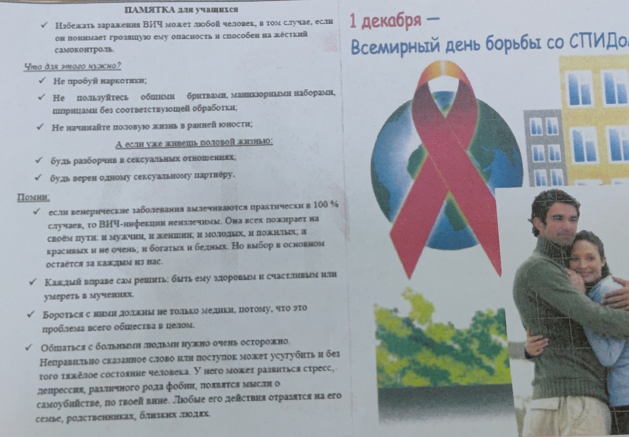 1 декабря в общежитии УО «Брестский государственный медицинский колледж» прошло тематическое мероприятие «Знание Ответственность. Здоровье». Учащиеся группы СД-223 подготовили памятки для учащихся, презентацию «СПИД: что нужно знать каждому», нарисовали плакаты. Ведущие провели с учащимися анкетирование и игру, посвященные знанию и ответственности за свое здоровье.